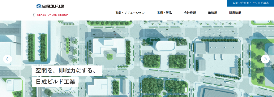日成ビルド工業は、営業から開発・設計、生産、施工、メンテナンスまでをワンストップで対応する、システム建築・プレハブハウスの総合メーカーです。
